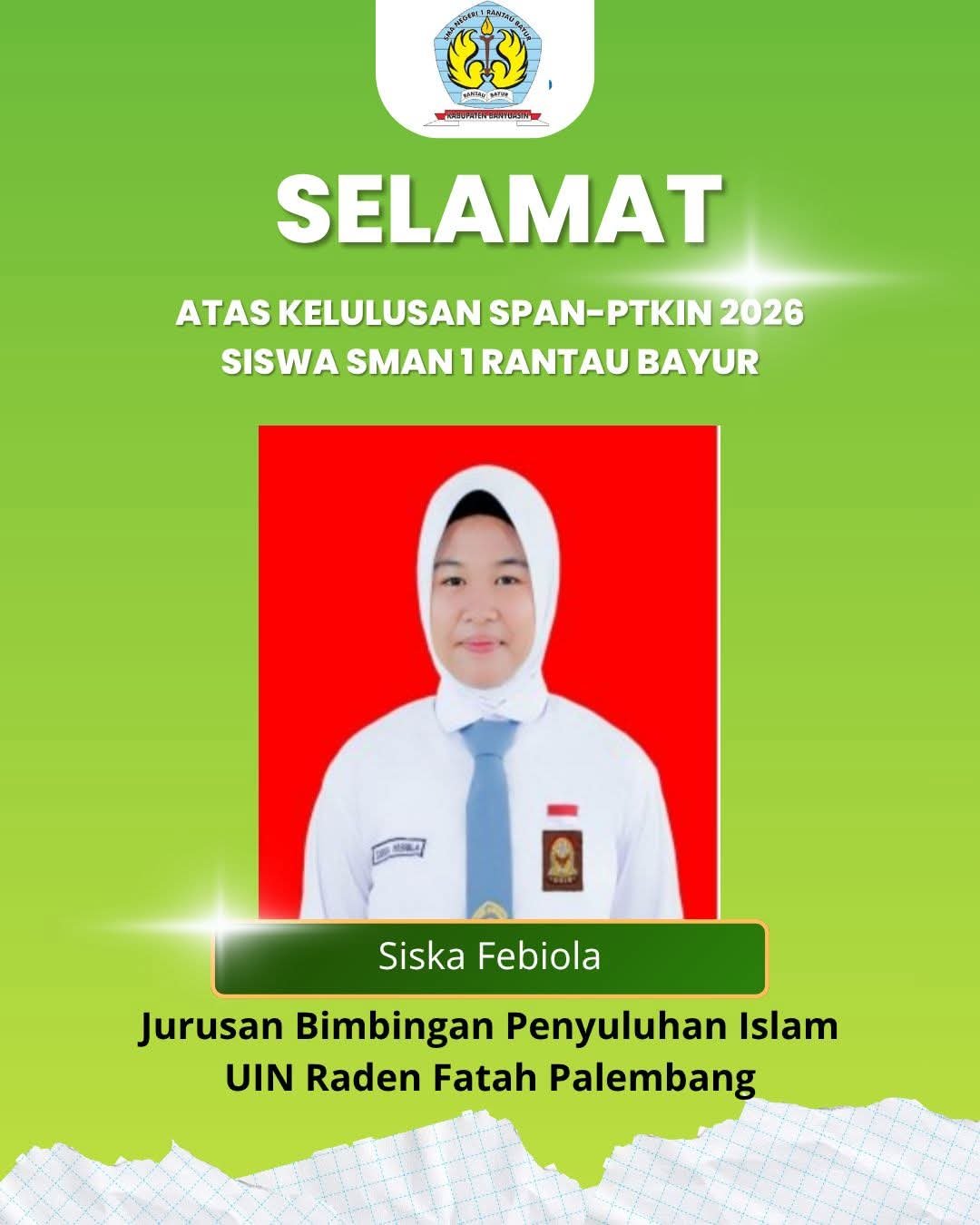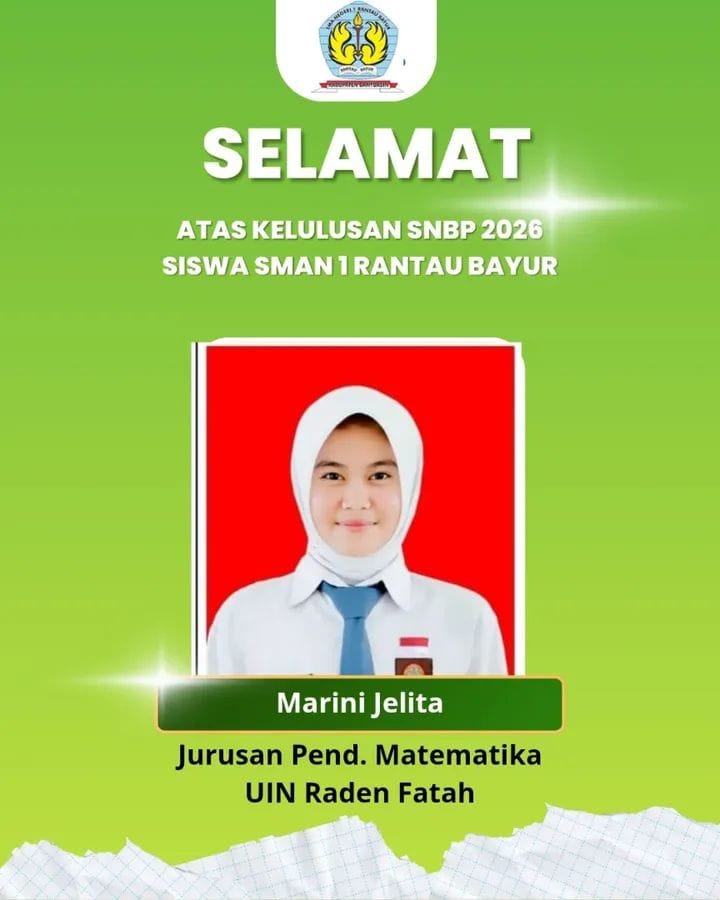 Journalpos.co–BANYUASiN – Prestasi Bu membanggakan ditorehkan oleh dua orang siswa SMA Negeri I Rantau Bayur, Kabupaten Banyuasin yang sukses masuk perguruan Tinggi Negeri (PTN) jalur Seleksi Nasional Berdasarkan Prestasi (SNBP) Tahun 2026.